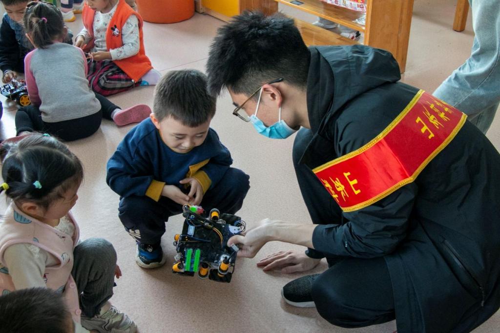 下午3点,志愿者们按时到达幼儿园,利用电动小车作为教学工具,生动地讲解了小车的构造和原理,向小朋友们展示了小车的运行和运动方式,与他们一同探索小车的奥秘,激发他们对科学的好奇心。小朋友们对志愿者的到来感到十分兴奋,认真聆听志愿者们的讲解,迫不及待地参与到电动小车的探索当中,表现出了对探索科学奥秘的渴望。