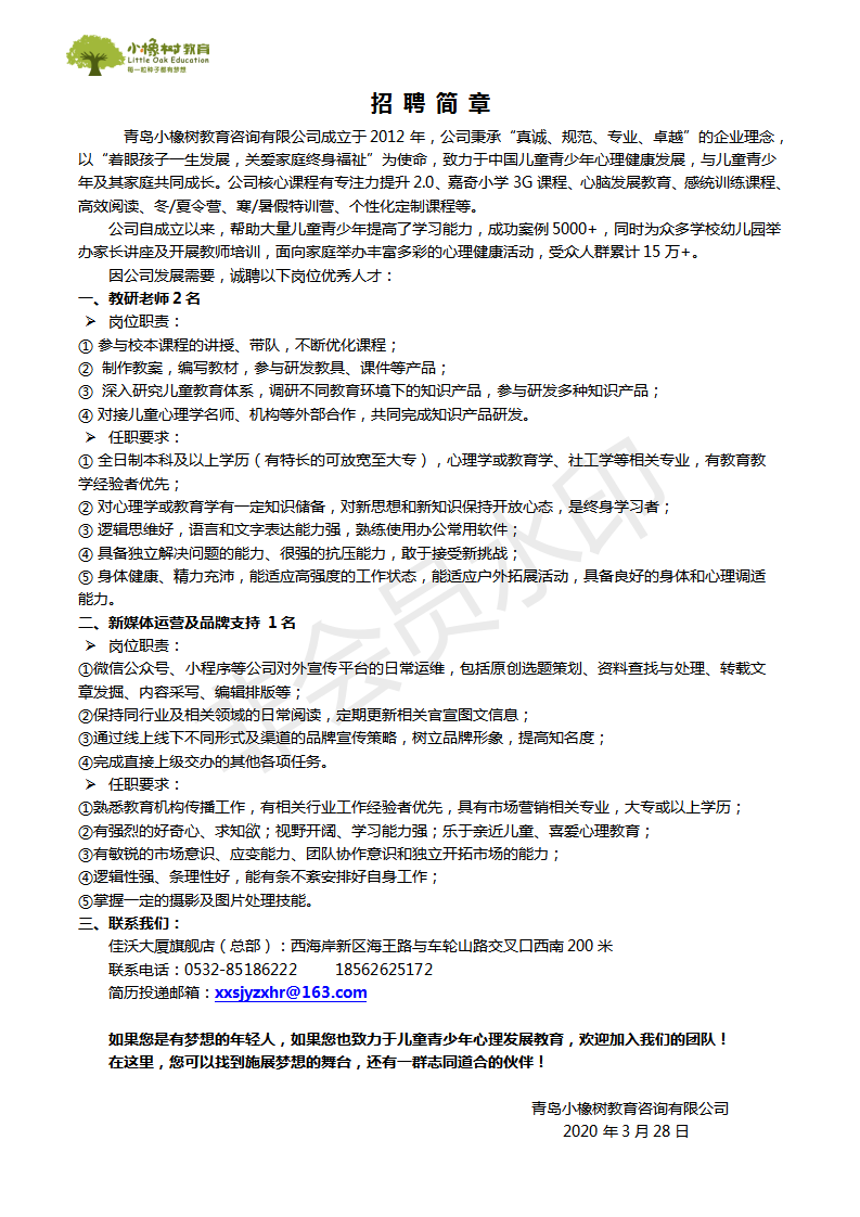 招聘信息022:青岛小橡树教育咨询有限公司招聘简章